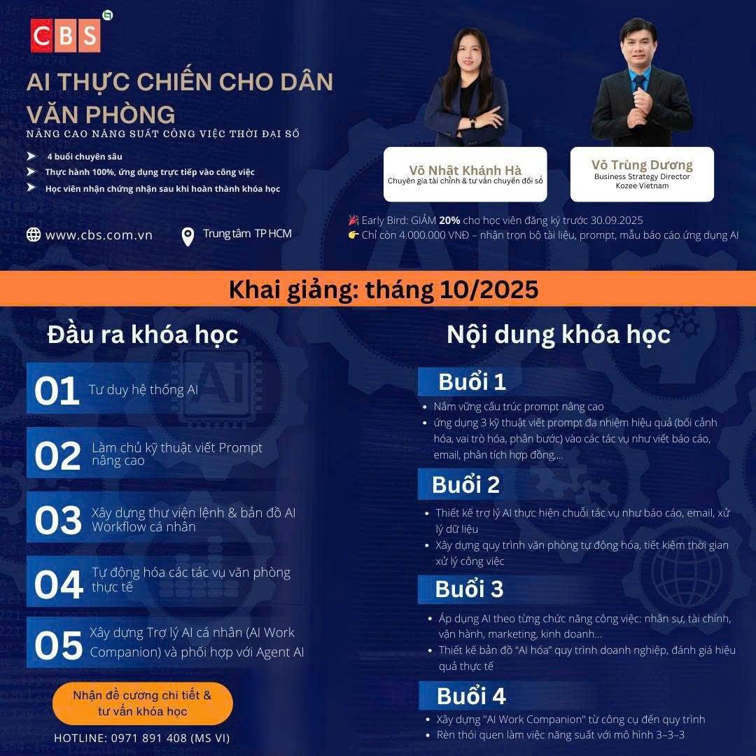 Early Bird: Giảm 20% học phí khi đăng ký trước 30/09/2025 (chỉ còn 4.000.000 VNĐ, bao gồm tài liệu & prompt mẫu)