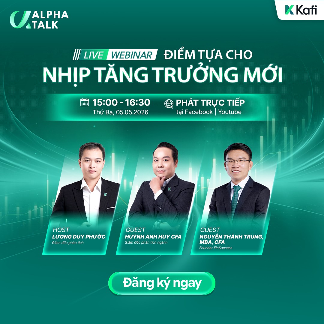Kafi Alpha Talk là chuỗi webinar chuyên sâu, nơi Kafi cùng các chuyên gia phân tích và giải mã những tín hiệu quan trọng của thị trường, từ đó giúp nhà đầu tư nhận diện cơ hội tăng trưởng vượt trội (alpha) và xây dựng chiến lược đầu tư hiệu quả hơn thị trường.
