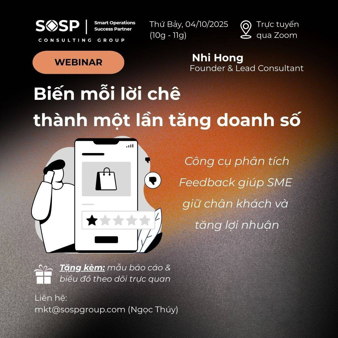 Nhi Hong – Thạc sỹ Quản Trị Kinh Doanh, Nhà Sáng Lập & Tư Vấn Quản Trị Vận Hành tại SOSP Consulting Group, 11 năm đồng hành cùng các doanh nghiệp FDI & SME tại Việt Nam. Từng trực tiếp quản lý và triển khai chiến lược Customer Feedback & Complaint Handling cho ngành thương mại điện tử, bán lẻ, dịch vụ và công nghệ.